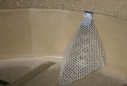 Can be installed in any size summer stock tank except sheep tanks. It is approximately 18" tall, 28" wide, and 33" diagonal. It is made of aluminum; it conforms to the side of the tank, hooks on the lip, and must be bolted into place.